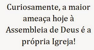 A denominação não tem projetos de grande porte. O que há são iniciativas isoladas. A Copa é o retrato disso. Aí vem uns pensadores falar apenas dos desvios doutrinários, esquecendo que muitos deles são apoiados e incentivados pelos próprios pastores. Quem não lembra do GMUH? Curiosamente, a maior ameaça hoje à Assembleia de Deus é a própria Igreja! Não ponham o Diabo nesse angu, há muito ele não precisa mais tentar os crentes assembleianos!