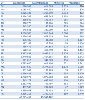 3) Rondônia inscreveu 226 ministros. Com 35% da população sendo evangélica, o que coloca o Estado no topo do ranking de estados mais evangelizados, teríamos uma proporção de 1.402 evangélicos por ministro. Sempre levando em conta que 60% dos evangélicos são assembleianos. Ou os evangélicos rondonenses estão mal assistidos ou os amazonenses estão sendo demais. Entenderam ou fui sutil? Se levarmos em conta que o Pará tem mais que o dobro de habitantes do Amazonas, aí o negócio desanda de vez!