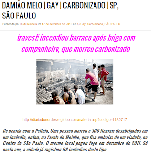 De acordo com a Polícia, Uma pessoa morreu e 300 ficaram desabrigadas em um incêndio, ontem, na favela do Moinho, que fica embaixo de um viaduto, no Centro de São Paulo. O mesmo local pegou fogo em dezembro de 2011. Só neste ano, a cidade já registrou 68 incêndios deste tipo. No início da tarde de ontem, quando o fogo já havia sido controlado, o suspeito de ter causado a tragédia foi preso. O travesti Fidelis Melo de Jesus era usuário de drogas e incendiou o barraco onde morava após discutir com o companheiro Damião Melo, que morreu carbonizado. Levado para o 77º DP (Santa Cecília), o suspeito foi indiciado por homicídio qualificado e por provocar incêndio.