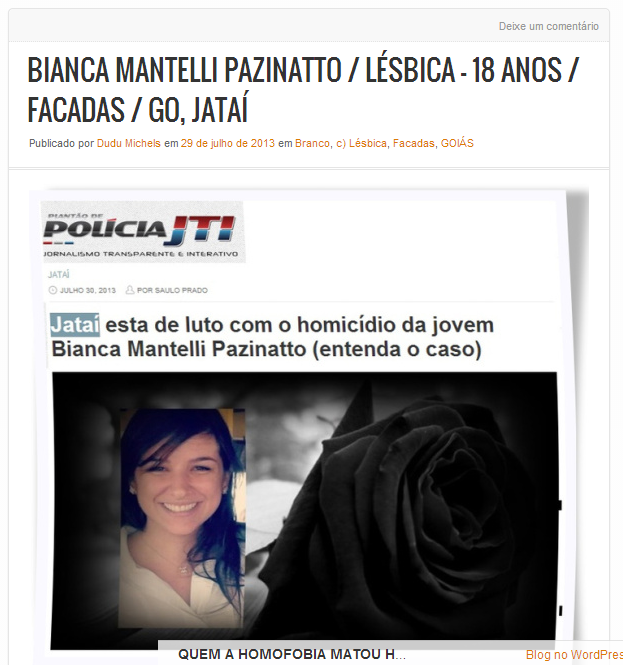 Fui ler a reportagem. É sobre uma jovem estudante de Biomedicina que foi morta a facadas por duas adolescentes no interior de Goiás. Detalhe: mantinha um relacionamento amoroso com uma delas. A polícia encontrou o corpo debaixo da cama da amante. Ela alegou que matou a estudante por motivos passionais, que teria sido traída com outra mulher, etc.