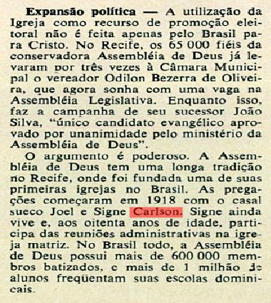 Prezado Pr. Altair, não tem problema. Gostaria de aproveitar a deixar para dizer o seguinte: creio que algum elemento a VEJA da época viu para alçar a nossa irmã a esta posição. A revista não chegaria à esta conclusão por acaso. Havia alguma indicação neste sentido, naquele longínquo 1972. Na pior das hipóteses o jornalista compreendeu pela obra que ela fazia, que sua desenvoltura a elevava à condição de líder. Mesmo que, como hoje, não lhe demos o bônus.