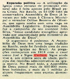 Para comprovar o que está na revista VEJA, clique aqui e procure a edição 219, página 60. Com indicação do Mário Sérgio, do blog Memórias das Assembleias de Deus.