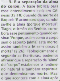 Ontem, 15/07, tivemos uma EBD recheada de participação. O horário estourou, as perguntas se acumularam, foi maravilhoso perceber como todos estavam participando. O tema da lição A Morte para o Verdadeiro Cristão, suscita muitas dúvidas e controvérsias, mas com a graça de Deus pudemos elucidar algumas questões levantadas. Como nem tudo são flores, na lição há um mal entendido, para ser educado. A figura abaixo, representa a página 19, no excerto o comentarista misturou alma e espírito. Não sei se foi intencional, mas induziu muitos professores a erro.