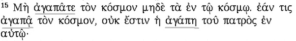 Já mostramos que este padrão não se sustenta, em outras ocasiões. Agora vem o texto áureo de amanhã: Não ameis o mundo, nem o que no mundo há. Se alguém ama o mundo, o amor do Pai não está nele (I João 2:15). Ameis, ama e amor são todos ágapê, como você poderá observar na figura acima, mesmo que não conheça a língua!