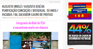 É o registro no site HomofobiaMata da morte de Augusto José da Purificação, conhecido na Bahia como Augusto Omolú. Era homossexual e foi morto violentamente. A entidade, que fornece os dados para Governos e mídia, taxou o caso como homofobia. Li o desfecho, excerto logo abaixo, e fui pesquisar no dito cujo, na mosca!