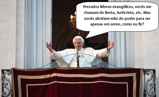 Quem assistiu à conclusão da anunciada renúncia de Bento XVI, pode perceber que não existe paralelo no mundo evangélico. Ele disse coisas como: “Sou um peregrino”, “Vou ajudar orando”, “Serei servo do novo papa”. Frases que fariam corar um concorrente a presidente da CGADB.